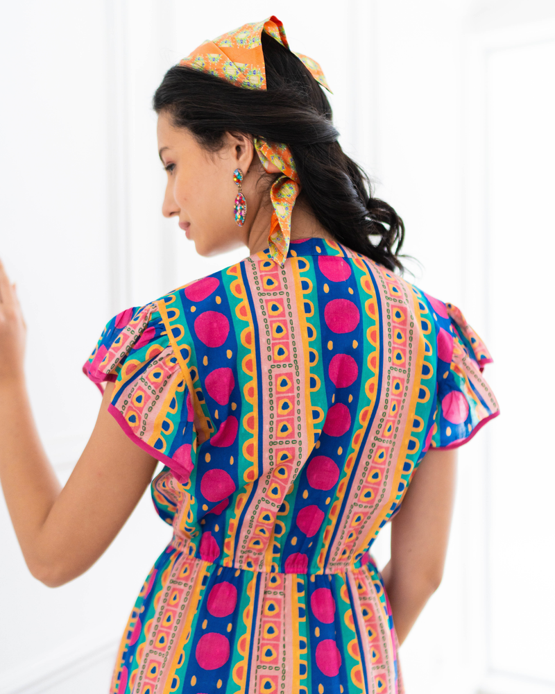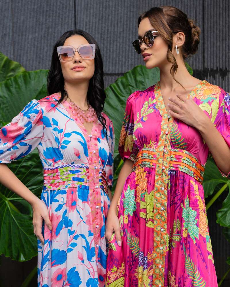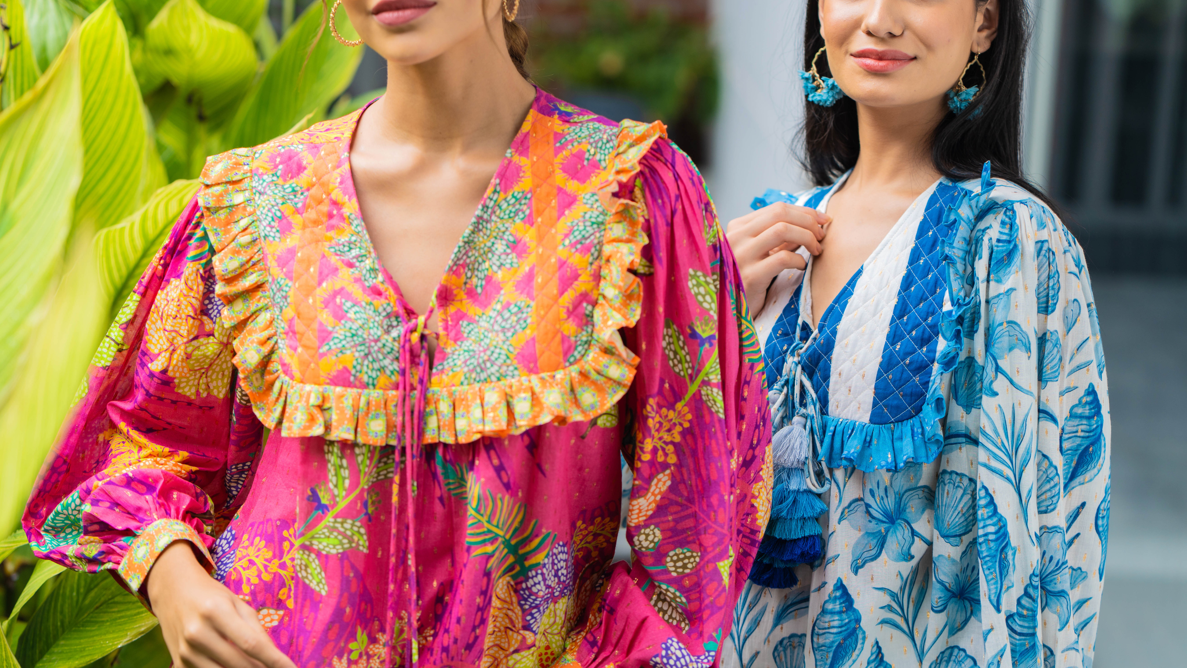 Each garment is meticulously handcrafted and adorned with traditional techniques by skilled Indian, artisan women. These women are often the backbone of their families and communities, and bring generations of knowledge and craftsmanship to every stitch, fold, and print.