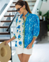 A breezy cotton silhouette with blooming Dahlia florals. The gentle pleats at the neckline and softly puffed sleeves are subtle yet impactful, finished with contrast placket and a soft high ruffle collar.