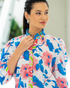 A breezy cotton silhouette with blooming Dahlia florals. The gentle pleats at the neckline and softly puffed sleeves are subtle yet impactful, finished with contrast placket and a soft high ruffle collar.